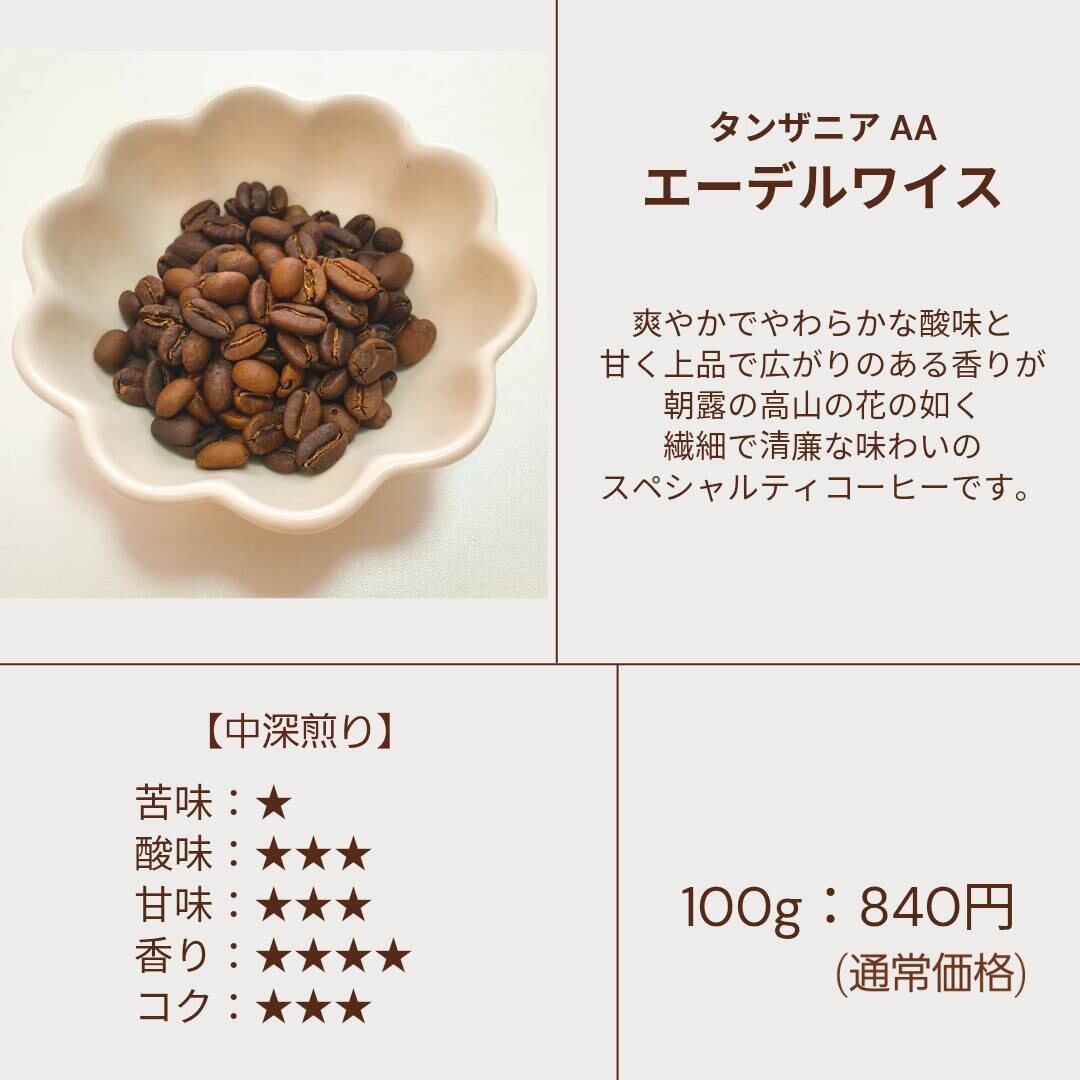 「タンザニア AA エーデルワイス 」は、タンザニア最高標のキリマンジャロの北部都市、アルーシャの西170kmに位置するオルディアニ地区内のエーデルワイス農園で栽培されます。